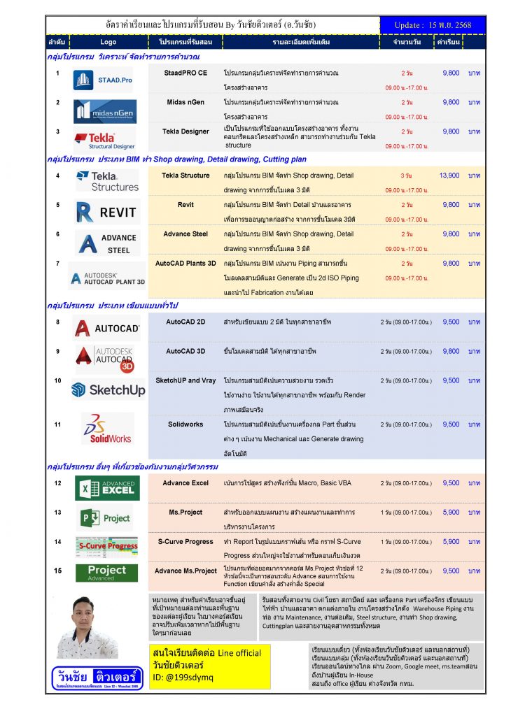 รับสอน, อบรมเขียนเเบบด้วย Auto-Cad, Solidworks, StaadPro, Tekla, Revit, AutoCAD Plant3D, sketupUP,Advance Excel, Microsoft Project